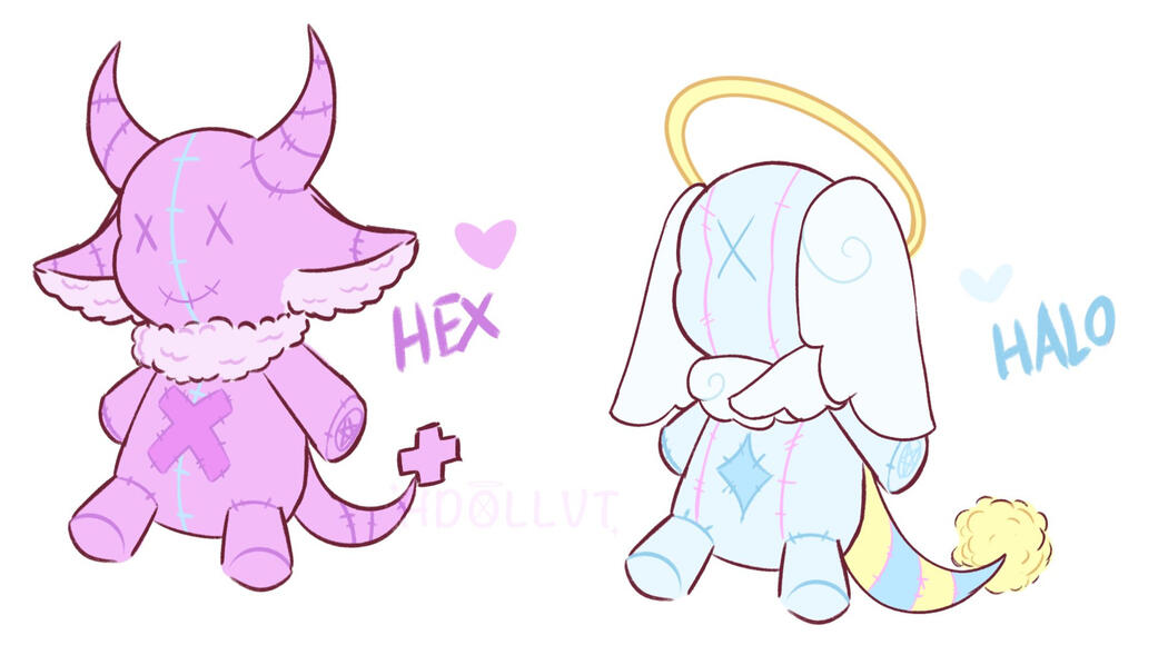 Hello, my name is Hollow! I am a plushie doll brought to life by the forces of evil and good (a demon and angel.) These forces are called Hex and Halo! I reside in the Dollhouse in Purgatory where I can move around fully independelty. Some have described purgatory as similar to"the backrooms." While I can't leave purgatory for extended periods of time, the dollhouse is completely safe for all visitors!(None of the scary Purgatory monsters will get you here 💜)